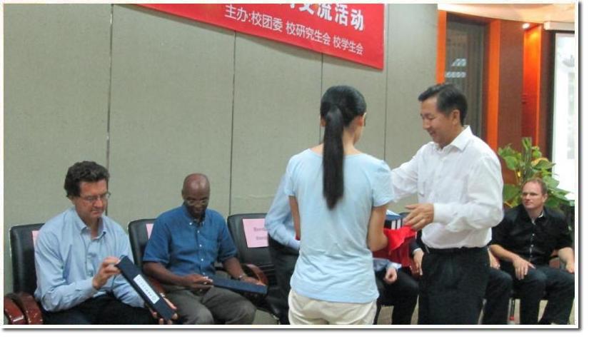 最后由张捷教授、杜江峰教授和俞书宏教授代表我校师生向16位远道而来的嘉宾赠送校园纪念品——校园风光丝绸折扇。嘉宾们在签名簿上签名,一起合影留念。