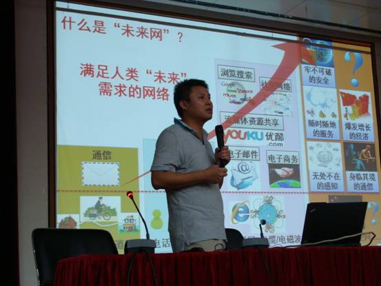 报告中,杨老师以“未来网”为主题,围绕“什么是未来网”、“未来网设施设备研究的意义”以及“中国在未来网研究中的地位与贡献”三个大问题,对“未来网”这一概念进行了全面、生动、形象的阐述,使同学们从一开始不知“未来网”为何物,变为对“未来网”抱有浓厚的兴趣,并希望以后能参与到“未来网”的研究建设上来。最后,杨老师再一次提及了“未来网”在中国的发展现状,并着重指出,将来“未来网”的发展需要各位同学的共同努力,希望同学们能将个人发展与国家前途命运结合起来,努力学习,勇攀科学高峰,为中国在“未来网”以及其他前沿技术研究中占得先机贡献出力量。