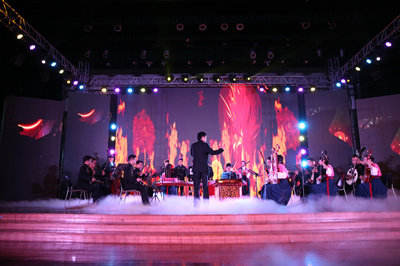安静中飘来一曲琵琶,“转轴拨弦三两声,未成曲调先有情”,瞬间,民乐《金蛇狂舞》全场喷发。锣鼓铿锵有力,管弦旋律流畅,情绪明朗热烈,气氛激越昂扬。乐声四溅欢快蔓延间,晚会帷幕已然拉开。