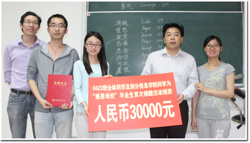 经0423班留校继续深造同学的倡议,在他们博士毕业前夕,0423班全体同学及部分信息学院同学参加“感恩母校”毕业生首次捐赠活动,为学校教育基金会捐赠3万元,设立“阳光印迹”基金。该基金用于邀请各界校友与在校生分享自己的经验阅历与人生体悟,并将支持相关学生社团开展活动,希望能为在校学生养成阳光、积极的心态提供帮助。