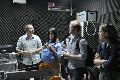 下午,代表团一行六人又分别对合肥微尺度物质科学国家实验室、火灾科学国家重点实验室和少年班学院进行了参观。微尺度实验室的教授和学生为学生大使们介绍了该实验室最近几年的学术成果和一些实验仪器的使用原理。火灾科学实验室的同学则为代表团成员现场演示了实验室最有名的实验“火旋风”,引起了们的阵阵掌声。参观少年班学院时,少年班学院的老师对本院的历史沿革、招生政策、培养方法以及所获成就进行了介绍,接着来自少年班学院的六名优秀学生又与代表团成员们进就自己感兴趣的话题进行了交流。