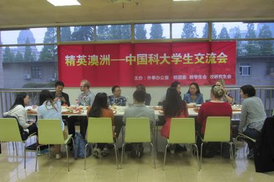当天晚上,在校团委的精心组织下,代表团成员又与七位来自不同专业的科大学子在东区教工餐厅进行了主题为“精英澳洲——中国科大学生交流会”的面对面交流活动。双方学生代表畅谈了各自的兴趣爱好、校园生活以及未来规划等,交流在热烈友好的气氛中进行。