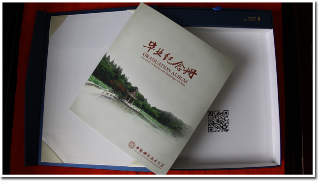 今年制作的纪念册仍采用分体式,主体是印刷精美的小册子,内有“科大大事记”、“科大之师”等栏目,此外,还有“寄语毕业生”、“恩师留言”、“同学赠言”。纪念册硬盒内,预留了“我的毕业合影”、“我的U盘”等空间,毕业生同学可以在盒内存放相关的证书、资料乃至毕业纪念T恤衫等。与往年不同的是,原来提供的收录校史图展和校园风物照片等资料的“我的大学”CD光盘,被今年的二维码取代,毕业生同学可以通过手机扫描,直接登录学校毕业纪念网(http://stuhome.ustc.edu.cn/by),浏览“科大简介”、“校园风物”、“科大轶事”等栏目。纪念册装帧精美,深受广大毕业生的喜爱。