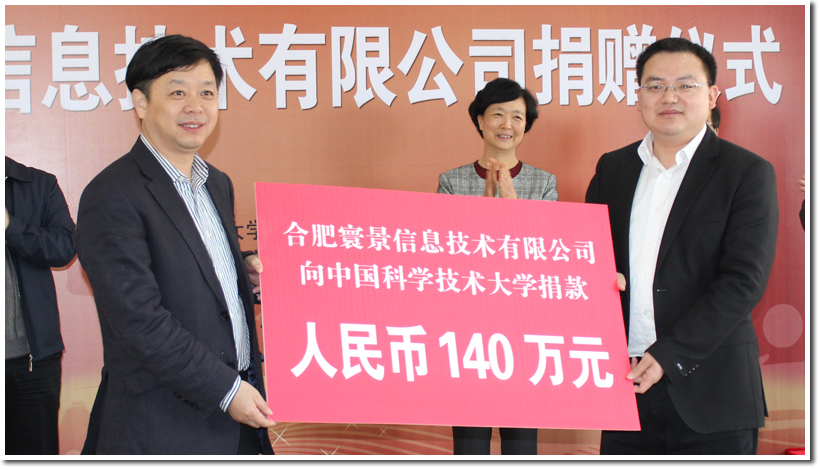鹿明代表学校对各位领导和嘉宾的到来表示热烈欢迎,对合肥寰景信息技术有限公司对学校的大力支持表示衷心感谢。她说,科大建校55周年来,在人才培养和科学研究方面取得了举世瞩目的成果。近年来,学校积极改善办学条件、发展高新技术学科、申请国家重大科技专项,努力助推世界一流研究型大学建设。学校的快速发展,既是学校内部凝心聚力、开拓创新的结果,也离不开外部资源的大力支持。越来越多的校友主动支持母校教育事业发展,合肥寰景信息技术有限公司总裁陈拥权先生就是回馈母校的杰出代表。欢迎更多的校友和社会各界人士参与学校的发展建设、与中国科学技术大学共同进步和成长。