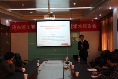 授聘仪式结束后,孙东教授为到场师生做了题为《一种基础结构网络的同步控制方法》的学术报告。他阐述了同步控制方法的概念,并生动形象地将同步控制思想与经济发展、环境保护等联系在一起,重点讲述了多智能体同步控制的运动协调问题,并定义了协调控制中的同步控制误差,介绍了两个应用同步控制理论的多智能体控制实例,以及遵循时间变化的多智能体编队控制及生物细胞医学领域的同步控制应用。与会师生就多智能体同步控制的建模方法、同步控制误差及同步控制在生物医学上的学科延伸等相关问题与孙东教授进行了热情的互动交流。