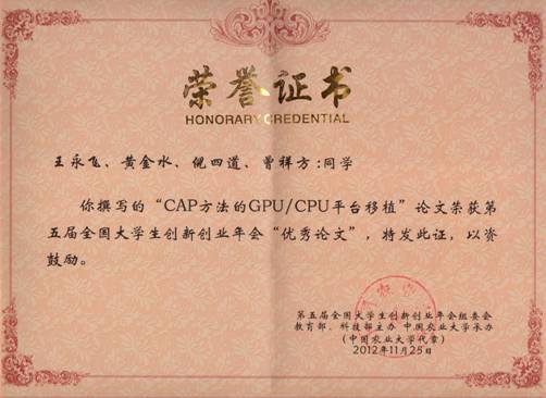 11月24日,由教育部、科技部联合举办的“第五届全国大学生创新创业年会”在北京举行,我校地球与空间科学学院王永飞同学撰写、黄金水教授指导的“CAP方法的CPU/GPU平台移植”论文,获得“优秀论文”奖并作大会报告。