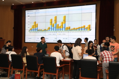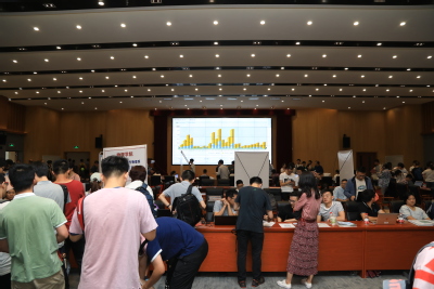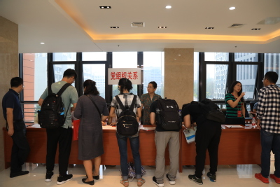 今年研究生新生报到处设置在新落成的物质科研楼。从入口处的平面导引图可以清晰看到,总咨询处、财务缴费、党组织关系、国家助学贷款咨询、一卡通充值、户籍迁入办理处等设在三楼,各院系报到处分布在二楼和三楼报告厅,各点分布合理、空间宽敞、办理便利。三楼报告厅内的屏幕上实时更新新生报到注册各项数据。