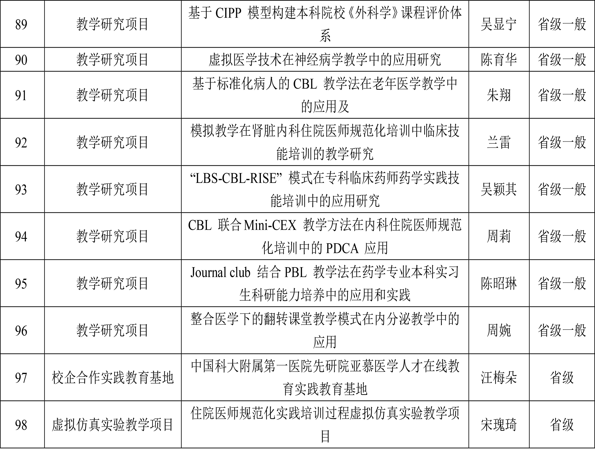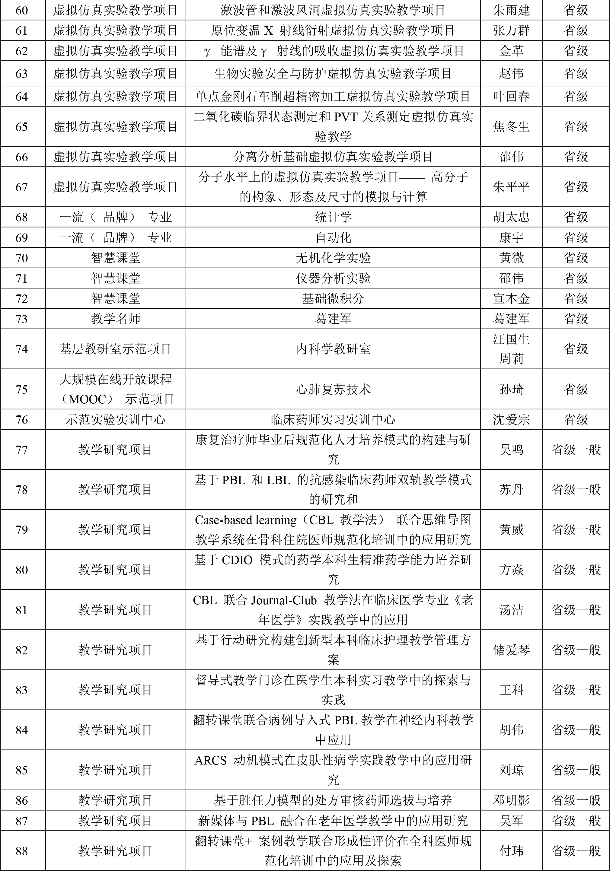 经过省教育厅组织的专家评审,我校安虹等4位老师被评为安徽省教学名师、代如成等5位老师被评为安徽省教坛新秀,“双一流背景下科研国际化带动人才培养国际化模式探索”等22个教学研究项目入选省级教学研究项目,“天文学导论”等8门课程入选省级大规模在线开放课程(MOOC)示范项目,“激波管和激波风洞虚拟仿真实验教学项目”等8个虚拟仿真实验教学项目入选省级虚拟仿真实验教学项目,“数学分析讲义”等16本教材项目入选一流教材建设项目。我校还入选一流(品牌)专业2项、高水平教学团队2项、基层教研室示范项目1项、精品线下开放课程1项、智慧课堂3项。另外,中国科学技术大学附属第一医院(省立医院)作为我校的附属单位参加省级质量工程项目申报,获批安徽省教学名师、省级教研项目等共计26项,取得了可喜的成果(见附件)。