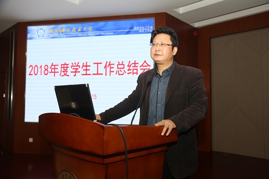蒋一代表学校向各院系学生工作负责人、学生工作秘书、辅导员班主任以及校学指委办公室成员单位各位老师表示感谢,充分肯定了各位老师2018年度的学生工作。他用“不易、投入、收获”三个词概括了科大学生工作的特点,希望各位老师继续做好思政育人工作,使学生的人格更加丰富,人生态度更加积极向上,能力得到充分发展。蒋一指出,老师的言传身教在学生管理中起着重要的育人作用,希望各位老师真正投入到工作中去,尤其抓好本科生入学第一年的学生工作,给予学生足够的关爱,建立互信和友谊。他介绍了学校书院制建设的基础思路和基本构想,指出科大的书院制建设需要学院专业老师、学院班主任队伍、专职辅导员队伍协同做好学生管理工作,全面促进学生成长成才。他表示,学校提倡辅导员班主任走专业化、职业化道路,也正在努力为学生工作队伍的后续发展做好制度保障。