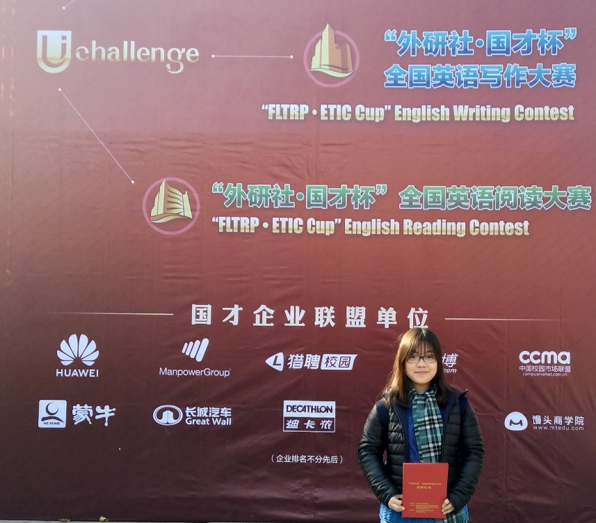 12月7-9日,2018“外研社·国才杯”英语写作大赛全国总决赛在北京举行。91名参赛选手从全国21万余人中脱颖而出,在全国顶尖舞台上以文会友,书写华章。我校数学学院一年级学生杨光明媚同学作为安徽省特等奖选手进入国赛并取得全国总决赛三等奖的好成绩。杨光明媚的指导教师是外语系汪滔老师,外语系张光前教授也在国赛准备环节对选手提出具体建议和写作指导。