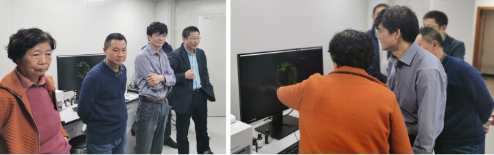 报告会后,陈佺教授在施蕴渝院士、周丛照教授、滕脉坤教授、田长麟教授、刘行教授等陪同下,参观了无膜细胞器与细胞动力学教育部重点实验室。刘行教授展示了教育部重点实验室近年来在基于三维类器官的化学生物学与无膜细胞器物理化学研究中的科研进展,并与陈佺教授就教育部重点实验室与药物化学生物学国家重点实验室在三维类器官开展膜性细胞器与无膜细胞器互作、细胞命运抉择机制研究等方面展开合作进行了广泛的讨论。