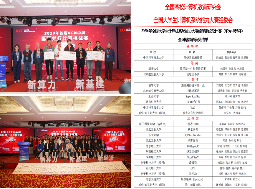 s4plus意为“系统软件与软件安全+X”,旨在以系统软件和软件安全为基石,开展支撑人工智能、物联网、端边云及量子计算等新一代信息技术的教研与科研。中国科大ustc-s4plus队在计算机学院、教务处、研究生院以及学校各院系老师们的支持下,在今年参与的几项重要赛事里,均取得了优异的成绩。在今年11月15日于北京举行的首届国际并行计算挑战赛(IPCC)决赛中,由研究生张宇翔、黄奕桐和本科生刘硕组成的ustc-s4plus队取得全国二等奖(第三名);在今年8月举办的2020年中国大学生计算机系统能力大赛首届编译系统设计赛全国总决赛上,在计算机学院李诚、网络空间安全学院李卫海老师的共同指导下,s4-plus研究组黄奕桐参加的“燃烧我的编译器”队以总分第一的优异成绩获得唯一特等奖,由刘硕、彭昀参加的“YAL”队获得二等奖。