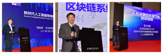 主旨报告中,梅宏院士作了题为“软件定义一切-现状与挑战”的报告,他认为在人-机-物融合计算的场景下,万物皆可互联、一切均可编程,分析了软件定义带来的机遇和挑战。周傲英教授作了“新时代人工智能带来的的启示”的专题报告,他指出互联网正在深刻改变着世界,彰显了数据的能源(Data Power) 属性。金海教授作了“区块链系统的技术挑战:分布式系统观”的报告,探讨了区块链作为分布式系统新形态所带来的新挑战,并展望了未来走向。吴文峻教授作了“人机物融合环境下的群体智能”专题报告,介绍了基于复杂系统的研究思路,并提出了一个初步的群体智能理论模型和系统设计的技术框架。