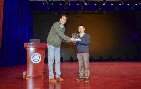 主题报告环节结束后,少年班学院院长卢征天教授向陈云霁研究员赠送了本科生“科学与社会”研讨课纪念牌,感谢陈云霁研究员为同学们带来的精彩报告。