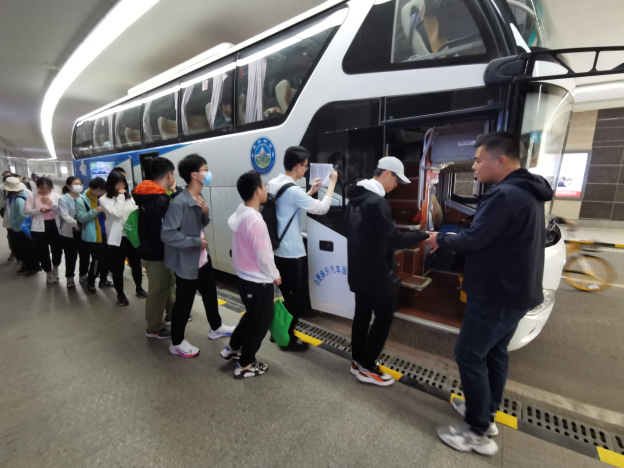 为做好疫情防控工作,工作人员提前为活动准备了口罩、消毒洗手液、测温枪等物品。早上七点一刻,全体师生准时到达乘车点,在工作人员的引导下有序排队测量体温、上车就坐。