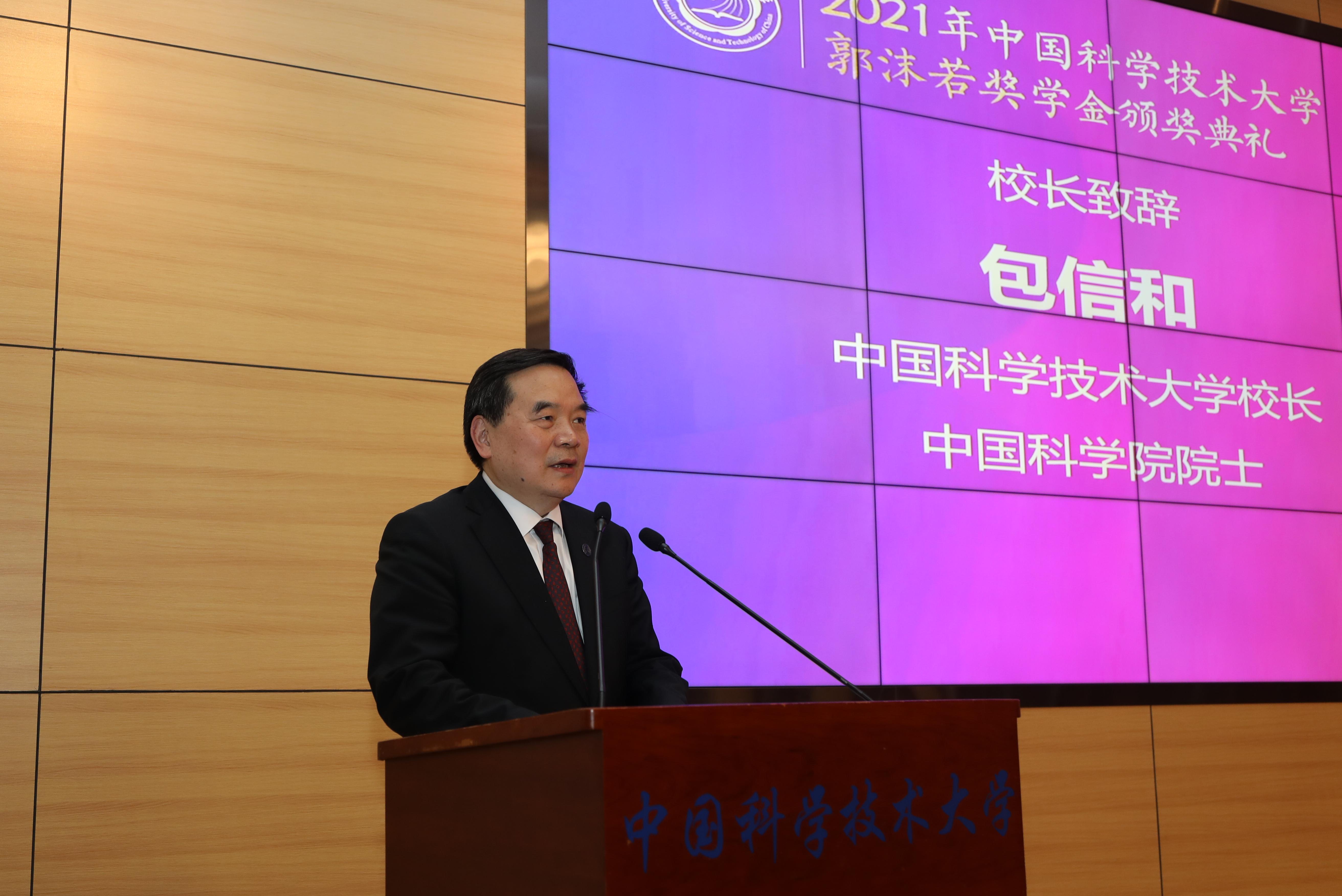 包信和校长首先对获奖同学表示热烈祝贺,并对远道而来的各位家长和老师表示欢迎和感谢。他以我校2010级少年班校友、第33届郭沫若奖学金获得者曹原,以及1993级校友崔屹为例,讲述了他们凭借着浓厚兴趣和执着的努力,在各自领域取得巨大成就的事例,希望同学们以他们为榜样,凭着初生牛犊不怕虎的锐气,燃动青春,锐意创新,闯出一片新天地。