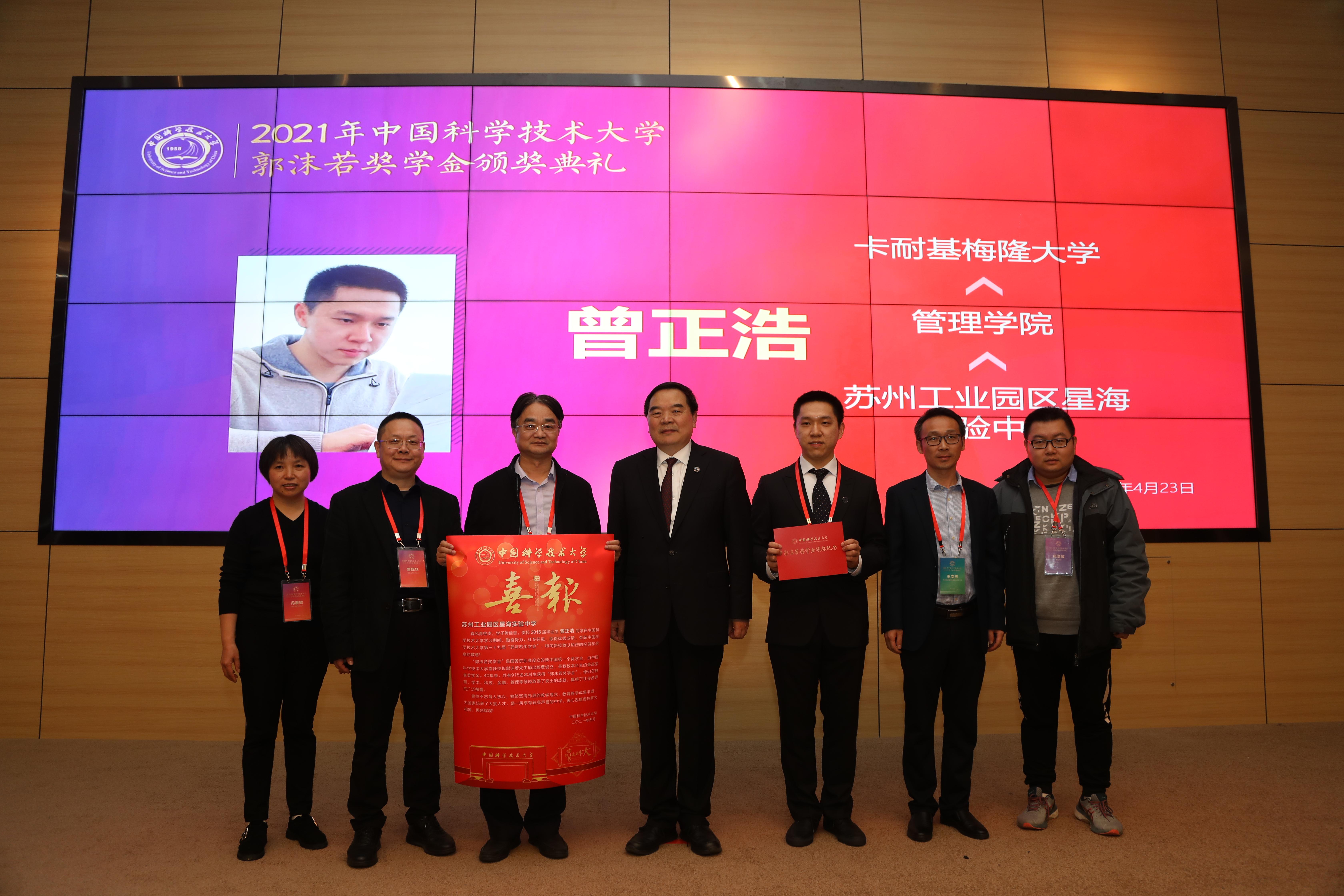 4月23日下午,2021年郭沫若奖学金颁奖典礼在东校区理化大楼东三报告厅举行。校长包信和院士出席典礼,向获奖同学送上深情寄语,并为他们一一颁奖。党委常务副书记蒋一主持颁奖典礼。党委常委、校长助理、教育基金会副理事长傅尧,校长助理、教务长周丛照,首届“郭沫若奖学金”获得者唐明校友,北京校友会会长刘冬生校友、新创基金会理事长石兵校友,中学校长代表、合肥市第一中学校长封安保,中学校长代表、华南师范大学附属中学副校长吴青等出席颁奖典礼。第39届、40届“郭沫若奖学金”获得者,以及部分获奖学生的中学校长、老师、家长和亲属参加了颁奖典礼。
