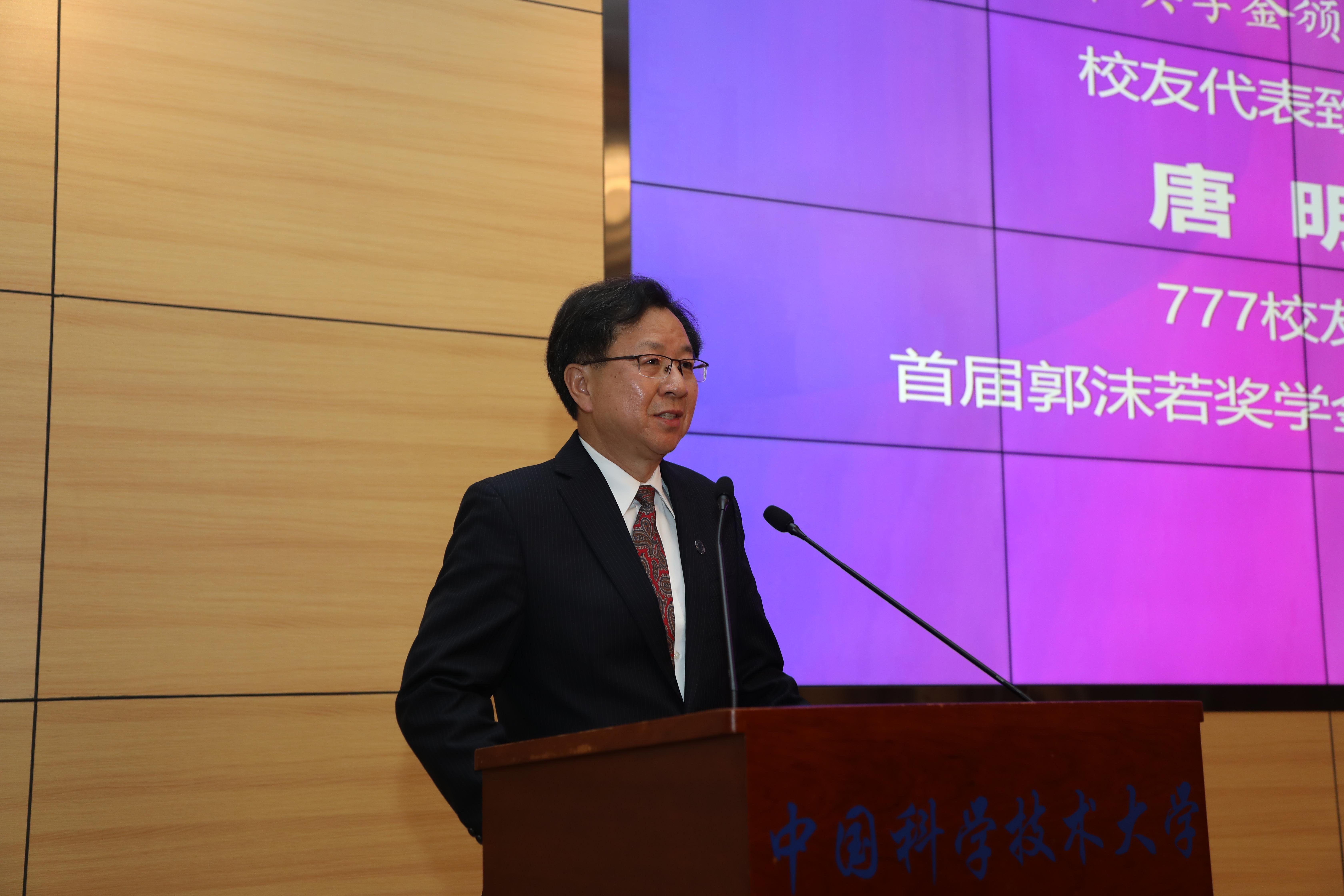 唐明在致辞中表示,四十年前,学校在大礼堂举行首届郭沫若奖学金颁奖仪式,自己有幸作为13位获奖者之一领奖。四十年前,一代毕业生从科大出发,走向各行各业,走向世界各地,有幸赶上实现民族复兴第一个百年征程,在不同的行业为这个目标的实现做出了自己的努力。回首四十年,百感交集,深感生逢其时。唐明表示,一代人有一代人的使命,同学们将亲自实现民族复兴的两个一百年奋斗目标。郭沫若奖学金既是荣誉也是责任,希望同学们带着荣誉重新出发,为母校争光。