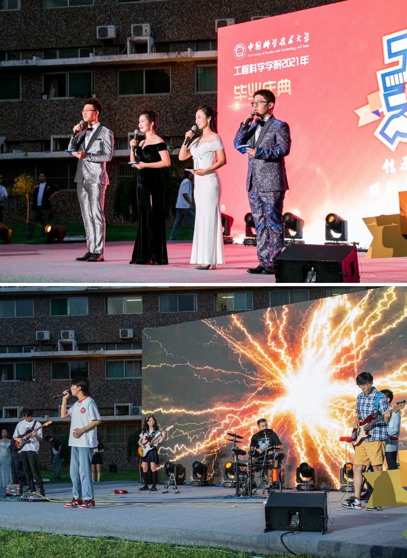毕业庆典以“传承科学家精神,践行新时代使命”为主线,以“工成之日、逐梦启航”为主题,由追梦人、一团火、满天星三个篇章构成。吉他协会feel乐队带来的《天涯》和《青春没有终点》火爆开场,带动了全场观众的热情。