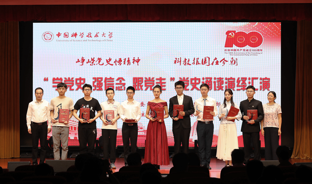 第三篇章,少年班学院《少年中国说》,信息科学技术学院《永远的旗帜,永远的中国梦》,国家同步辐射实验室(核科学技术学院)《苦难辉煌》,环境科学与工程系、生命科学与医学部《党旗颂》,地球与空间科学学院《重温峥嵘复兴路,继往开来奏华章》和先进技术研究院《敢为人先》号召广大同学学史明理、学史增信、学史崇德、学史力行,鼓足奋进新时代的精气神,奏响科大的新时代强音。