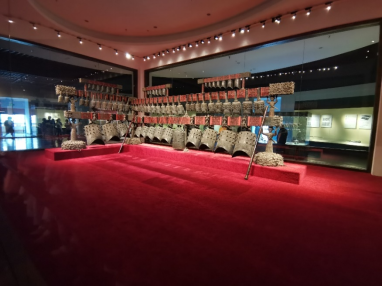 博物馆共分三层,首层便是引人注目的曾侯乙墓系列展览。曾侯乙编钟是目前发现的规模最大、保存最完整的青铜编钟,有着“编钟之王”美誉。站在它的面前,我们被它深深震撼。两千年之前,祖先就已制成了这件3层8组共56件的绝世之作,用这精美的乐器奏出恢弘乐章,成为中华民族的骄傲。