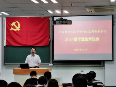 2021年6月22日下午,网络空间安全学院教工党支部举办了2021届网络空间安全学院毕业生欢送会。本次活动聚焦毕业生在未来的深造和就业中将要面临的问题和困难,为毕业生做好思想引领和经验总结工作。大学是人生旅途的一个驿站,毕业意味着走出象牙塔和舒适圈,在这个人生的十字路口,毕业生对未来充满期待和迷茫。本次主题活动的主旨在于引领毕业生以乐观、积极的心态面对人生的挫折与挑战,坚定正确的政治立场,保持家国情怀,为实现中华民族伟大复兴的中国梦贡献力量。欢送会由学院党总支书记谭勇同志主持,学院教工党支部共有12位党员参加,另有其他学院的2名党员教工也参加了本次活动。