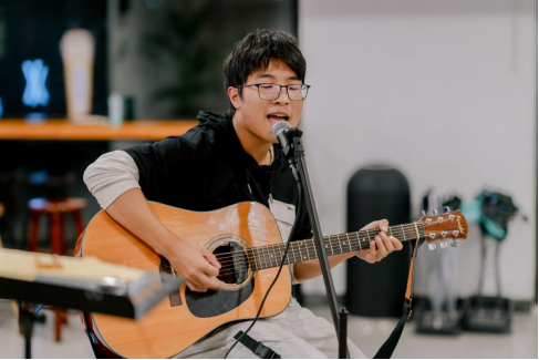 正式演出阶段,校学生吉他协会的乐手依次登台表演,带来了一曲又一曲美妙动听的乐声,在场观众无不沉浸在音乐享受中。乐手们轻轻拨动琴弦,跳动的音符如同流水一般飞泻,伴着窗外的夜色浅唱,激发了观众的共鸣,将现场气氛带入高潮。