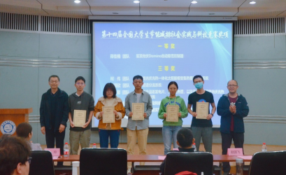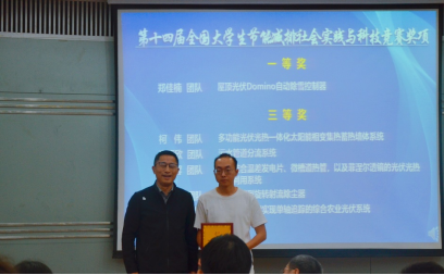 颁奖环节,周丛照为获得第十四届全国大学生节能减排社会实践与科技竞赛一等奖的郑佳楠团队颁奖,刘明侯、赵国飞依次为获得三等奖的柯伟团队、唐颖欣团队、温馨团队、贾壮壮团队、郑佳楠团队、米尔力团队颁奖。赵林、牟玲、张文真、于全夫分别为获得社会实践、科技类奖项和校赛科普、艺术类奖项的团队代表颁奖。