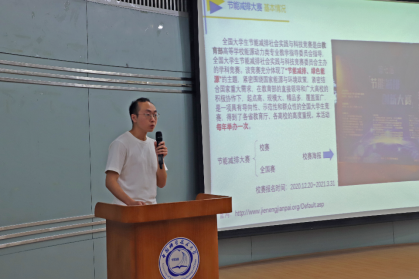 郑佳楠作为第十四届全国大学生节能减排社会实践与科技竞赛一等奖的代表为老师和同学介绍了其作品《屋顶光伏Domino自动除雪控制器》的工作原理和研发过程。此技术意在解决中高纬度地区的光伏系统在冬季因积雪覆盖而导致光伏系统的高效发电限制问题和建筑垮塌的安全隐患问题。作品在全国赛中获得一等奖和四项专利。他还向在场同学分享了项目研究开展的思路和参加节能减排创新大赛的基本流程及宝贵经验,号召同学踊跃参与学校各类科创比赛。
