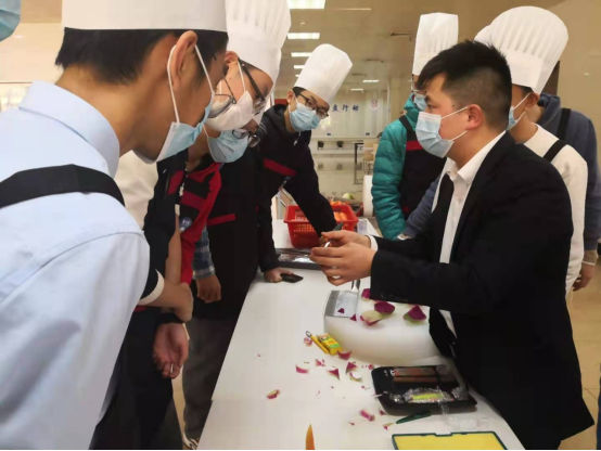 随后同学们逐个练习用胡萝卜雕刻简易好看的太阳花,由于同学们的水平参差不齐,对雕刻的理解深浅不一,在雕刻的每一步,黄老师都会细心指导点评,使每位同学都能亲手创造出自己的食雕作品。