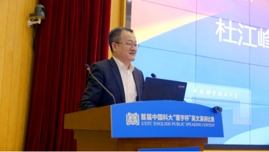 杜江峰在致辞中指出,此次英文演讲比赛的主题“我和我的祖国”符合时代语境。今年恰逢中国共产党百年华诞,百年恰是风华正茂,党团结带领中国人民又踏上了实现第二个百年奋斗目标新的赶考之路。中国科大是一所具有红色基因和敢为人先特质的学校,家国情怀、使命担当是科大人应有的特质。当前,常规化国际交流活动因疫情受限,学校正努力营造国际化氛围,通过各类活动,打造中外学生“内循环”交流平台。希望通过本次比赛,促进学生的综合素质和讲好中国故事能力的提升,也希望各位同学积极修炼“内功”,为在后疫情时代积极参与国际交流做好准备。