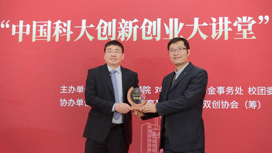 在活动最后,创新创业学院副院长、教务处副处长吴强为熊雨前校友颁发了“创新创业大讲堂”纪念牌。熊雨前校友表示以后将更多参与到母校的创新创业教育工作,为同学和校友们的创新创业事业贡献一份力量。
