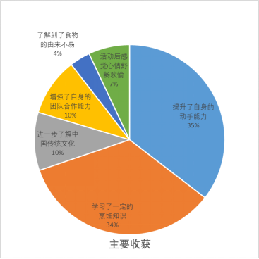 每次课程结束后主办方会向同学们发放调查问卷,统计结果显示,参与同学中2020级本科生最多,报名参加两次以上课程的学生占比超过一半,最吸引同学们来参加课程的原因是:对此活动形式感兴趣、想要掌握一定的烹饪技能、想要进一步了解中国传统文化。“主要收获”的选项中排名前列的是:提升了自身的动手能力、学习了一定的烹饪知识、进一步了解中国传统文化、增强了自身的团队合作能力、活动后感觉心情舒畅欢愉。