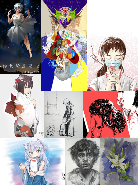 本次画展共展出作品92幅,其中流体画20幅,板绘53幅,素描、水彩、钢笔画等19幅。作品题材广泛,内容丰富,充分展现了蜗壳画社同学们的审美情趣与艺术修养。