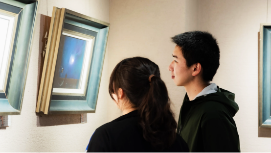 来到现场参观的同学们络绎不绝,同学们在展厅里认真欣赏作品,相互交流,体会艺术之美。