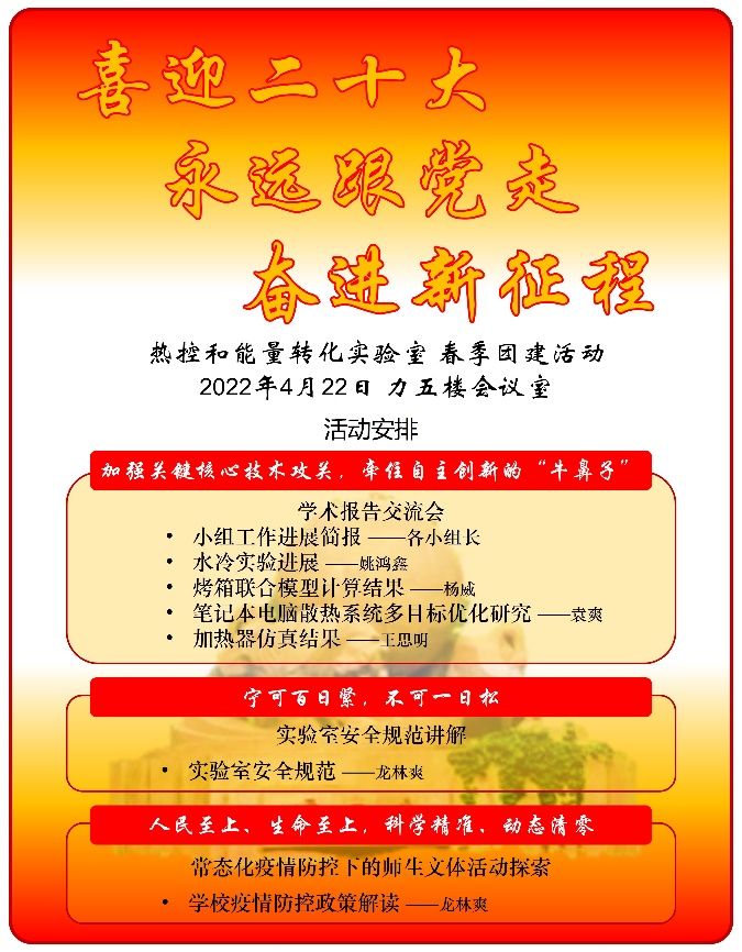 为迎接党的二十大胜利召开,积极响应习近平总书记关于统筹发展与安全论述,我院热控和能量转化实验室于4月22日在力学五楼会议室举行了名为“喜迎二十大、永远跟党走、奋进新征程”主题团建活动。热控和能量转化实验室一直以工程应用中的热物理问题为牵引,开展关键核心技术攻关。本次活动在科研学术报告的基础上,结合当前形势,增添了安全生产和疫情防控主题,力求将科研、实验室安全与疫情防控一体推进。实验室全体师生20余人参加了此次活动,活动由特任研究员龙林爽主持。