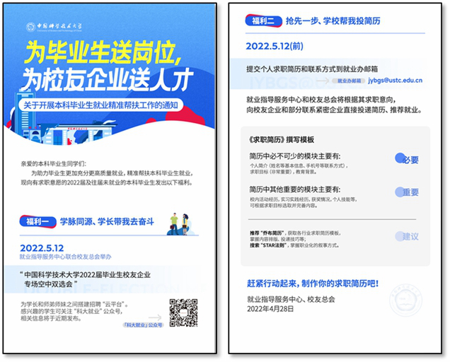 重点群体精准帮扶。招生就业处联合校友总会向有求职意向的本科毕业生发出两大福利,一是“学脉同源、学长带我云奋斗”,举办校友企业专场双选会,不设专业限制,重点招收本科毕业生;二是“抢先一步、学校帮我投简历”,收集毕业生简历,并向校友企业、部分紧密联系企业重点投递简历、推荐就业。目前,已收集42份本科生求职简历,向近百家用人单位进行了推送,陆续有同学反馈,收到多家企业的邀约,正进入双向选择、面试考察等环节。