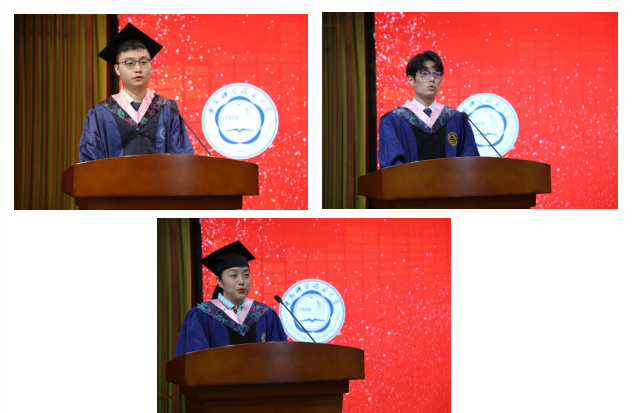 2019级公共管理法学班张序铭、2019级法律硕士班姚志伟、MPA中心杨菁三位同学分别代表毕业生发言。张序铭首先向恩师和同学们表达了感激之情,他表示将会用一生去诠释“红专并进,理实交融”的校训,用行动和奋斗书写无愧于新时代、无愧于科大人的华彩篇章。姚志炜首先表达了激动和伤感的心情,回首了过去三年在科大的美好记忆,表达了对父母与老师的感恩之情和对母校依依不舍的留念,他表示,自己将不辜负母校的培养和老师的教诲,在今后的工作岗位上争做青年先锋。杨菁表示,无论同学们毕业后身在何方,都将始终牢记学校的培养和期望,作为新时代科大学子,要具有高远志气、蓬勃朝气、昂扬锐气、浩然正气、铮铮骨气和十足底气,在坚持不懈的奋斗中跑出好成绩,为母校争光添彩,他希望科大学子们都能做到“今天我以科大为荣,明天科大以我为光”!