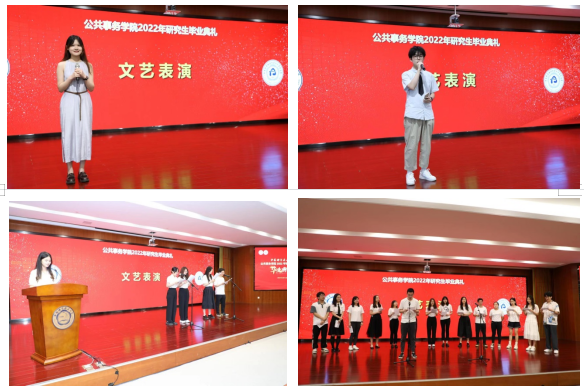 典礼还进行了文艺表演。2021级法律硕士班林嫄欣、陈晨两位同学分别为大家带来精彩独唱《清白之年》和《这世界那么多人》;接着由2021级公共管理法学班带来方言朗诵节目,朗诵者通过一幕幕的细节,感怀母校,祝福母校!有趣的歌曲串烧曲目,寄托着大家对过往的追忆、对当下的留恋,以及对未来的期许!最后全体师生一起合唱《送别》,婉转悠扬的旋律中满怀同窗之间依依惜别之情!
