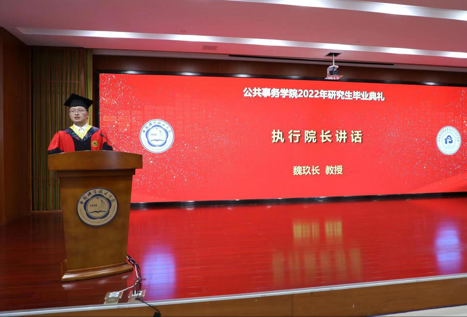 六月的校园生机盎然,处处洋溢着青春气息。6月11日上午,中国科学技术大学公共事务学院2022年研究生毕业典礼在东活五楼报告厅隆重举行。学院执行院长魏玖长,党委书记丁望斌,副院长陈伟、芮锋,MPA中心主任藏武芳,法律硕士中心主任杨辉,研究生部主任宋小燕,研究生导师张姝教授,副教授孙启贵、刘国华、宋澜、彭小宝、蔡文静等,毕业班班主任及2022年140余位毕业生共同参加了典礼。毕业典礼由学院党委副书记蒋文娟主持。