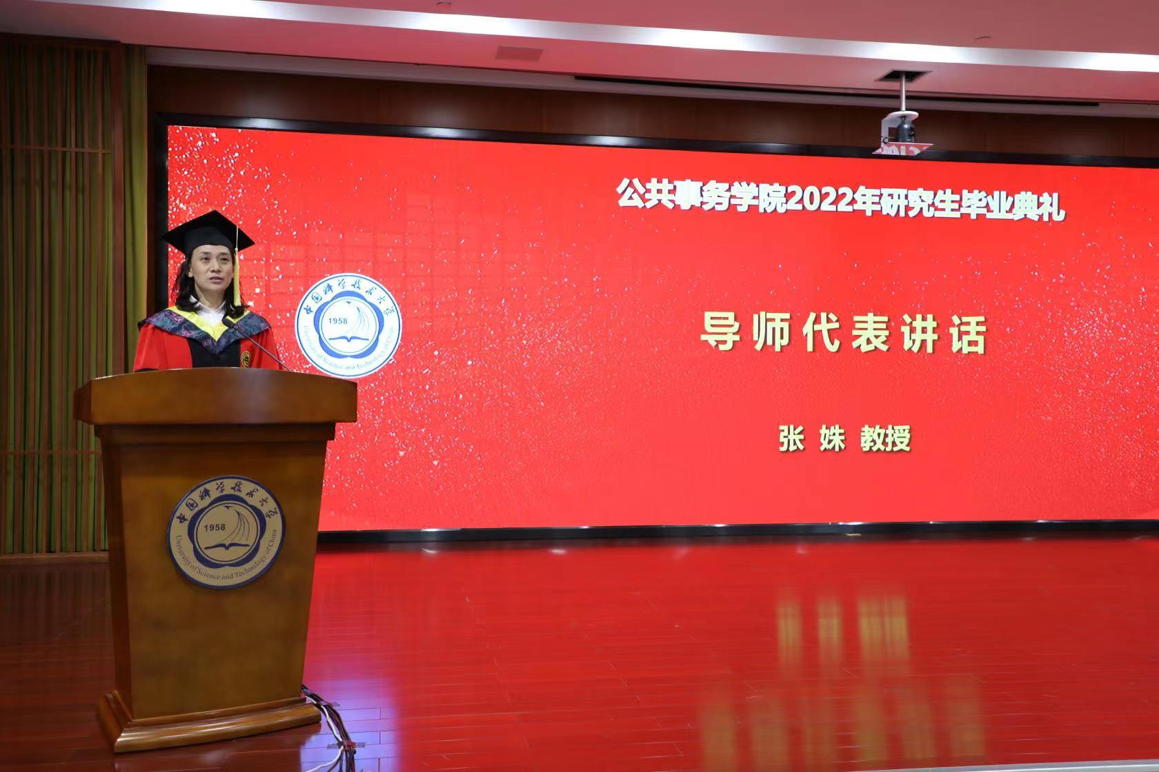 张姝教授作为导师代表讲话。她表示,教师是世界上最幸福的职业,因为有幸陪伴和见证年轻人的成长。她希望同学们踏入社会之后,能够不断提升境界和格局,以青春的自我成就精彩的人生。一是要涵养赤诚之心,保持科大人本色,把红专并进的校训精神融入血脉;二是要秉持勇毅之心,甘当追梦人先锋,积极投身新时代大潮,发扬斗争精神,敢于迎难而上;三是呵护澄明之心,永葆年轻人朝气,始终保持蓬勃朝气、昂扬锐气、浩然正气,保持青春的能动力和创造力,以年轻人的清澈和纯粹引领人生河流奔涌向前。