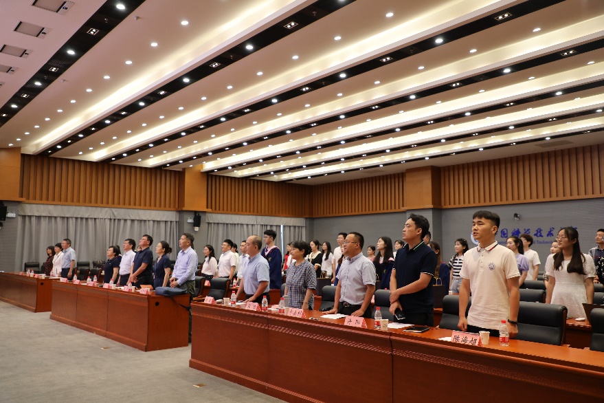 毕业典礼在庄严的国歌声中拉开帷幕,全体起立,奏唱国歌。