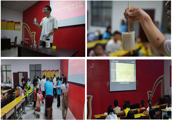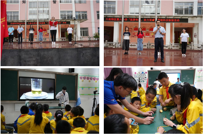 在六枝特区第六小学校长欧春欢迎声中,“筑梦科技,助力双减”暑期科学体验活动开始了。实践团向小学生们演示“猪油制作肥皂”,“土豆变色”及“爆聚实验”等小实验,并普及相应化学知识。实践团还指导孩子们自己动手搭建土豆电池。