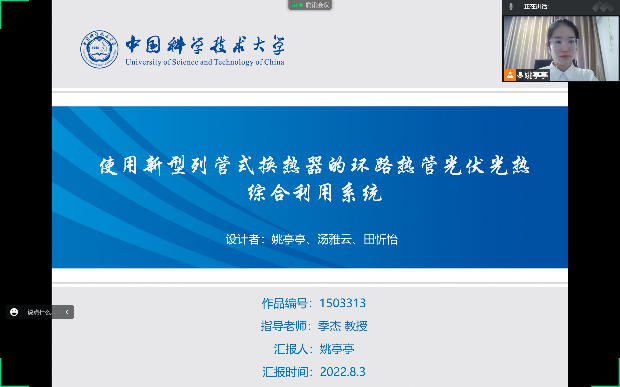 8月3日下午,我校入围全国赛决赛的队伍参加了线上答辩。参赛同学精神饱满、详细流畅地介绍了作品的设计背景、应用场景和特色功效。经全国赛评审委员会评议,我校工程科学学院季杰教授指导、硕士研究生姚亭亭、汤雅云、田忻怡设计的作品《使用新型列管式换热器的环路热管光伏光热综合利用系统》获得全国一等奖,我校获得优秀组织奖。