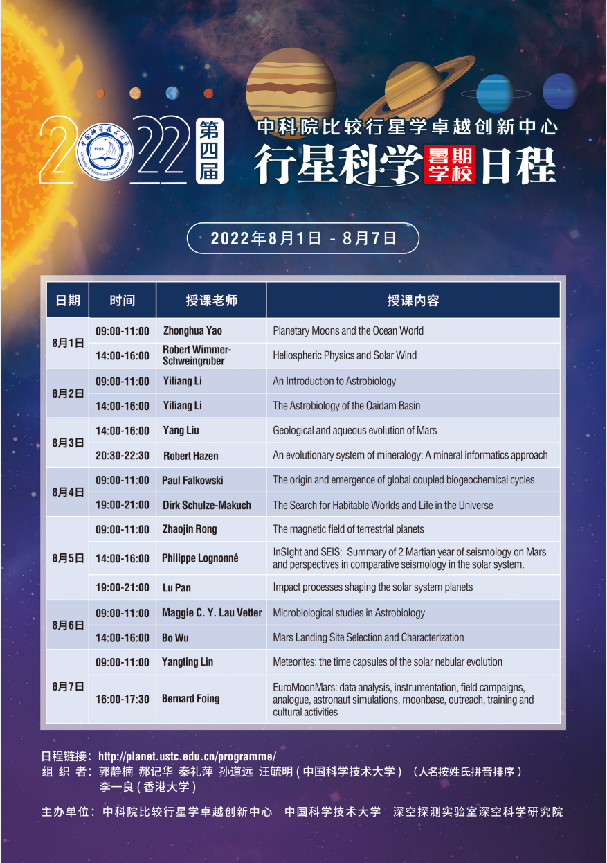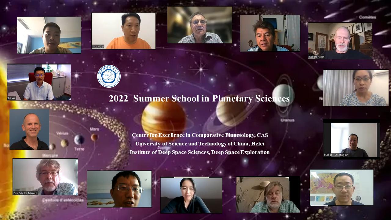 由中科院比较行星学卓越创新中心、中国科学技术大学地球和空间科学学院、深空探测实验室深空科学研究院共同主办的第四届“行星科学暑期学校”于2022年8月1日-8月7日顺利召开,由于受到新冠疫情的影响,本届“行星科学”暑期学校继续采用线上形式(Zoom)进行。本期暑期学校邀请了中国、美国、德国、法国、荷兰和丹麦共计14位行星科学研究前沿的著名专家学者授课,其中包括美国国家科学院院士、多名美国地球物理联合会会士以及国际行星探测项目负责人。来自国内多家高校和科研单位以及境外包括美国、德国、英国、瑞士、瑞典、法国、印度、以色列、克罗地亚、斯里兰卡及港澳台等300余名学生和年轻学者注册并参加了本期行星科学暑期学校,此外还有众多未注册学员也参加了线上学习。累计在线学习人数达到2.7万人次,其中单次在线学习人数最高超过3500人次(据coshare网络直播统计)。