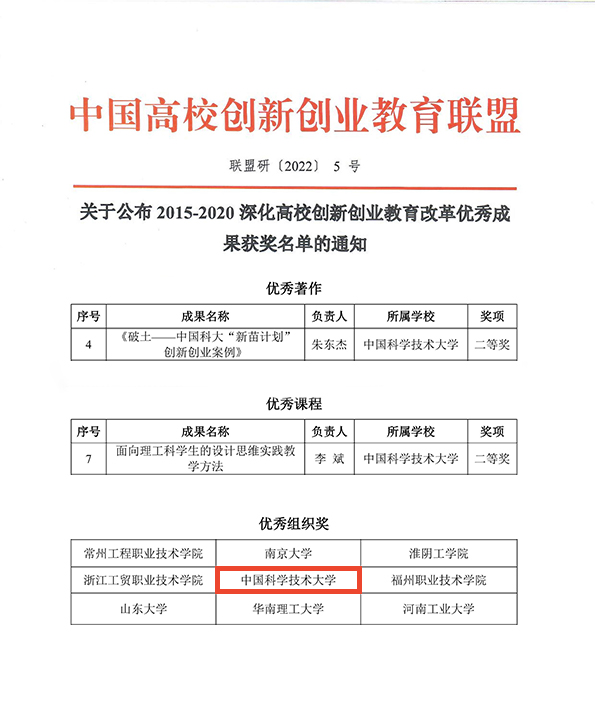 8月23日,中国高校创新创业教育联盟发布“2015-2020深化高校创新创业教育改革优秀成果获奖名单”,我校创新创业教育案例集《破土——中国科大“新苗计划”创新创业案例》、创新创业课程《面向理工科学生的设计思维实战教学方法》双双入选,分别荣获“优秀著作”二等奖,“优秀课程”二等奖,同时我校也获得“优秀组织奖”。