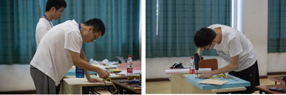 “理论设计与操作”团体赛的赛制采用4轮积分赛的形式,每轮比赛由3名队员合作,针对给定问题进行理论分析、力学设计并最终动手操作完成实验比赛。经过全国各高校个人赛成绩层层选拔和按地区原则遴选,有中国科学技术大学、哈尔滨工业大学、上海交通大学、复旦大学、北京航空航天大学等37支高校代表队、156名参赛队员参加了本届团体赛的比赛。