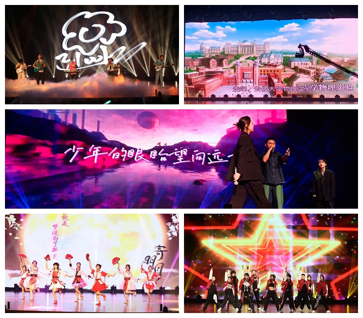 校学生吉他协会Bloom乐队《闪光的回忆》让人想起了使人热泪盈眶的追梦时光;校学生第十二夜广播剧配音社《大物过家家》借助动漫形式,诙谐幽默地展示了校园学习生活;校学生动漫协会特意带来舞蹈《寄明月》,共度中秋佳节;校学生街舞协会的《青春中国》以青春之我,书写青春中国;乐队山南公社《为科大而唱》,以青春的热忱,向科大献礼,全场观众齐声合唱,将晚会气氛拉到最高点。