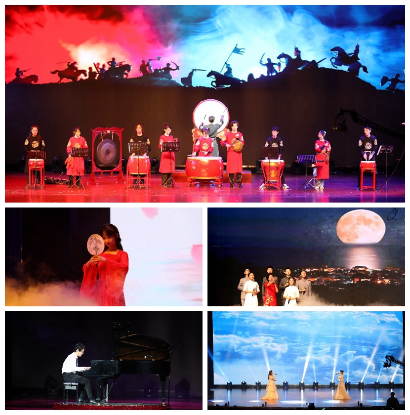 校学生民乐团以一首《秦王点兵》开场,气势恢宏庞大,仿佛带大家穿越历史,再现了鼓角争鸣的壮阔场景;新生龚雅馨同学的独舞《棠梨煎雪》用翩翩舞姿为我们讲述了一个诗情画意的故事;校学生主持人俱乐部带来朗诵《月光下的中国》,让观众感受月光下的中国长城巍峨、大河奔流;钢琴独奏《肖邦:降b小调第二钢琴奏鸣曲,作品35:第一乐章》带我们走进了肖邦的音乐王国;歌曲《飞云之下》唱歌所有离家求学孜孜不倦的学子,将晚会气氛拉入高潮。