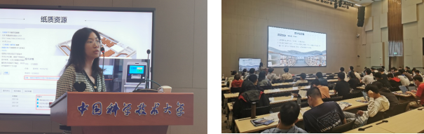 随后,高新园区图书馆负责人汤雨微对图书馆资源和服务进行详细介绍。汤老师从图书馆概况出发,对图书馆资源使用方式进行指导,并结合实际例子介绍了文献检索和分析等服务的使用方法。